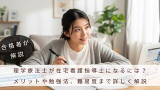 医療・健康 【合格者が解説】理学療法士が在宅看護指導士になるには?メリットや勉強法、難易度まで詳しく解説 訪問看護で働く理学療法士の方へ。在宅看護指導士になるには?この記事では、受験資格や費用、合格率、資格取得までの5ステップ、勉強法まで徹底解説。看護の知識を身につけ、専門性を高める第一歩を応援します。 2025.09.30 医療・健康